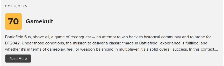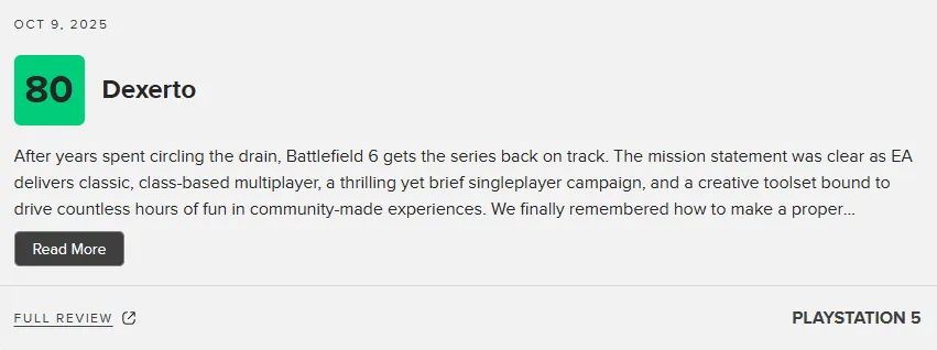 万众期待的FPS作品《战地6》,即将于10月10日正式发售。而这款由战马工作室制作,EA发行的新作,一经问世就受到了极大关注,玩家们此次也将体验到全新的大战场全面体验。现在,关于《战地6》评测的各大媒体评分已经解禁,截止发稿之前,M站均分为83分。以下是具体的几个媒体评分,你赶紧来了解下吧!