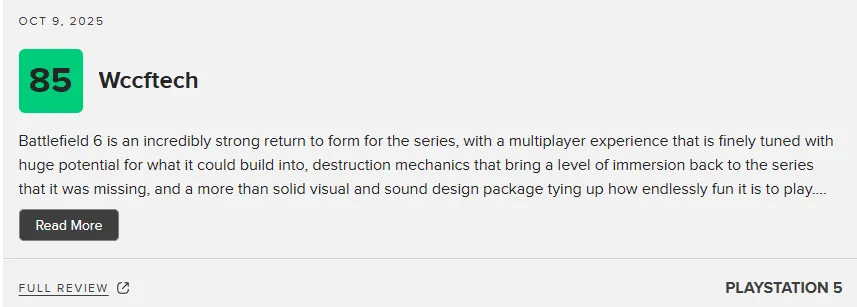 《战地6》是一场令人惊喜的强势回归,多人模式经过精心打磨,潜力巨大;其出色的破坏机制让系列重拾沉浸感,而视觉与音效设计也极为出色,整体呈现出纯粹的游戏乐趣。虽然单人战役略显平庸,但多人体验足以弥补这一短板。