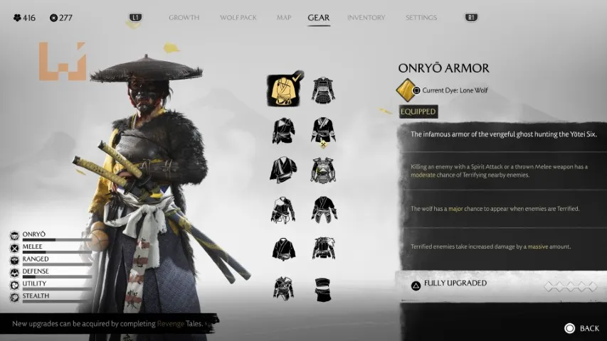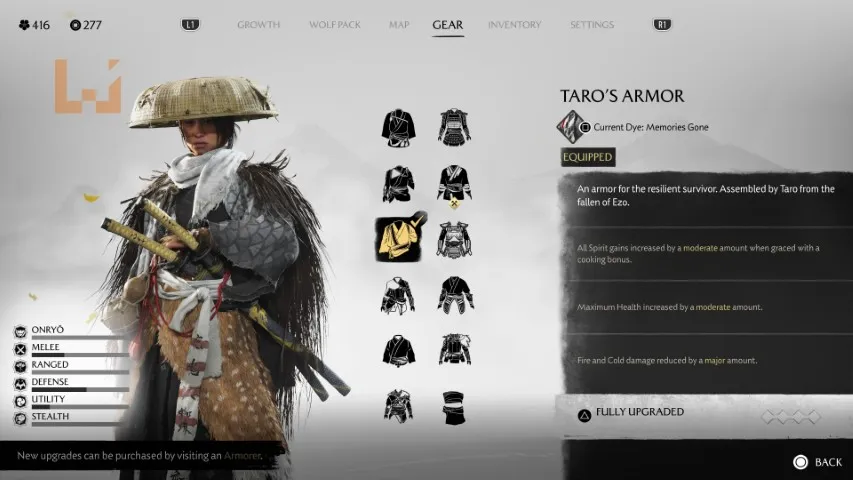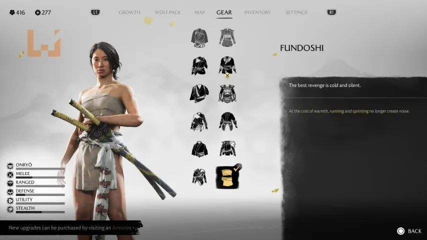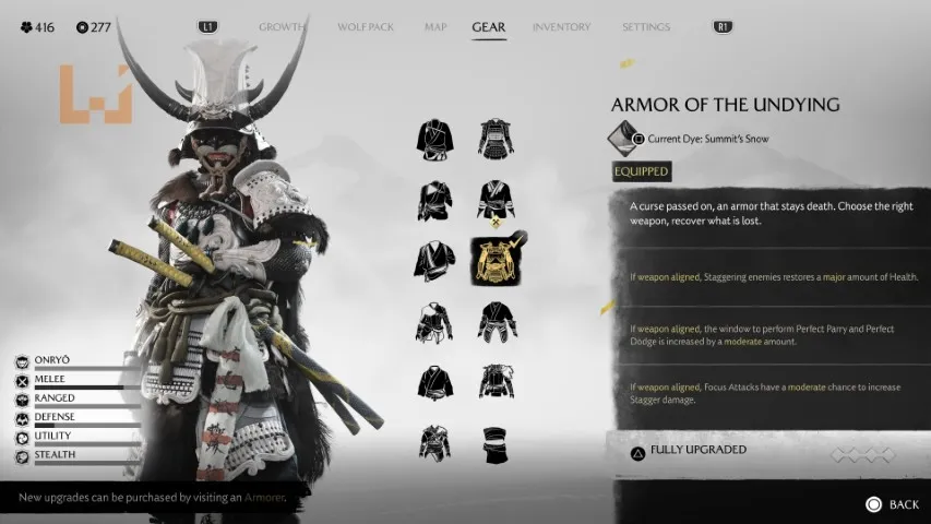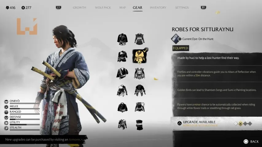 前往石狩平原地区的「说书人休憩处」,在熊袭击现场附近可找到「说书人雨月」。击败「不死武士」并赢得决斗后,即可获得这套传说铠甲。