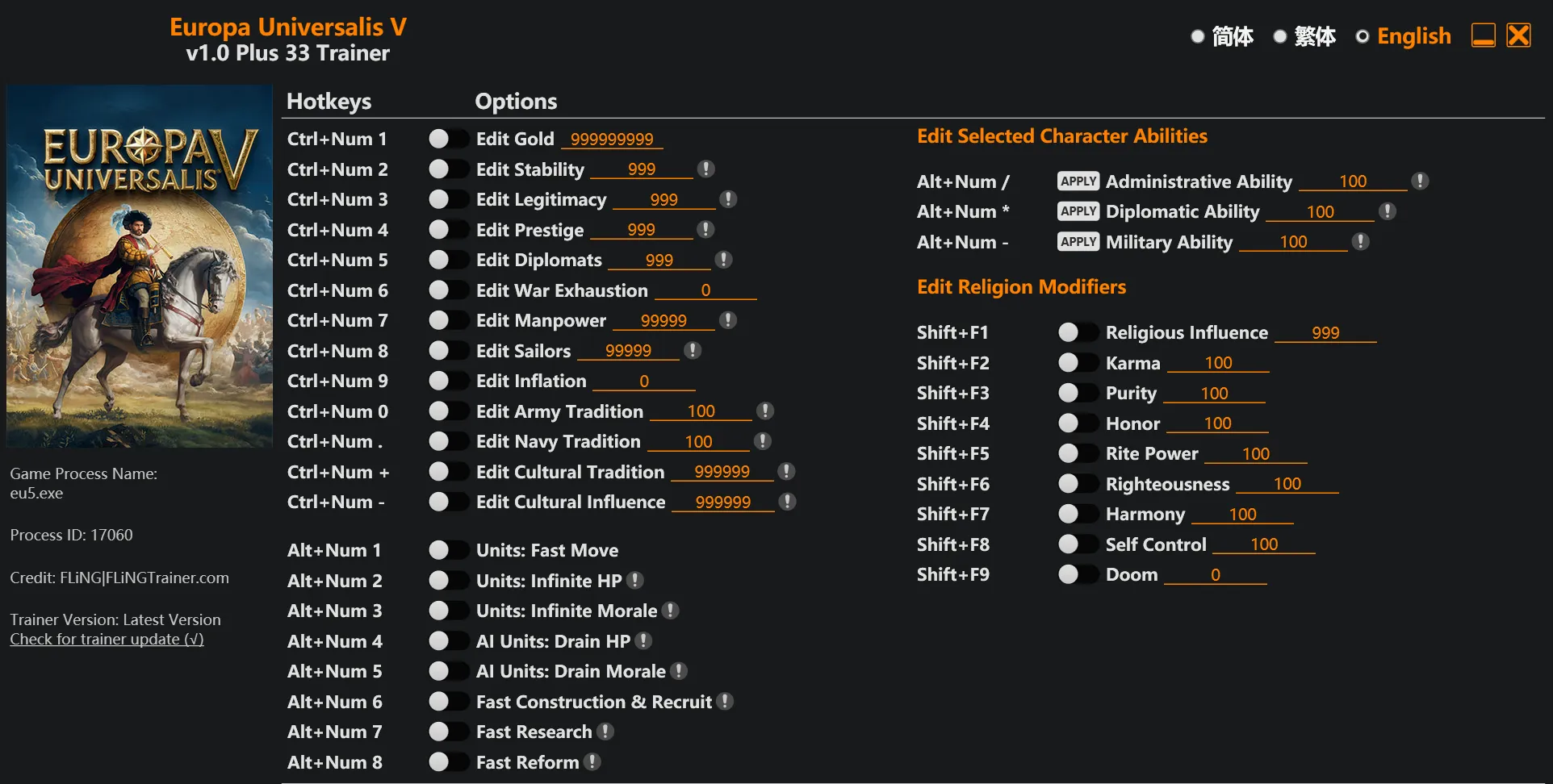 主打策略经营的游戏作品《欧陆风云5》,是一款人气超高的作品,玩家则要作为君主,凭借出色的经营手段和外交策略来逐步让自己的国家强大,更要注意自身军事才能的培养,赢下每一场艰苦的战争。当然,你要想玩的更轻松的话,就可以来使用这款欧陆风云5修改器风灵月影版,功能丰富,肯定能帮到你!
