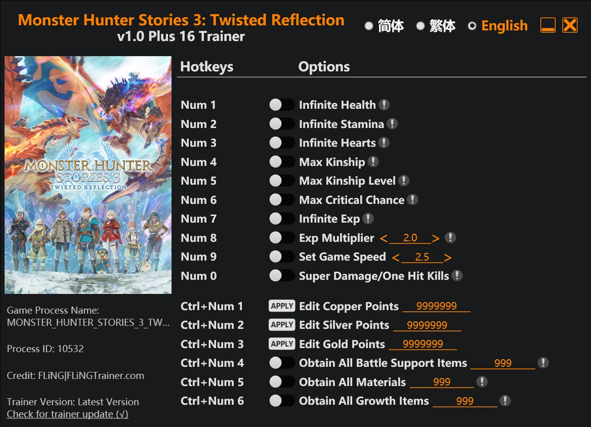 基于《怪物猎人物语》系列打造的全新作品《怪物猎人物语3命运双龙》,是一款可玩性十足的角色扮演游戏。玩家们将会与怪物们产生羁绊,通过悉心培育来提升它们的属性,并且还有精彩的剧情来供各位体验,而小编提供的这款怪物猎人物语3命运双龙修改器,功能相当多样,能够让你们的游戏之旅变得更加丰富。